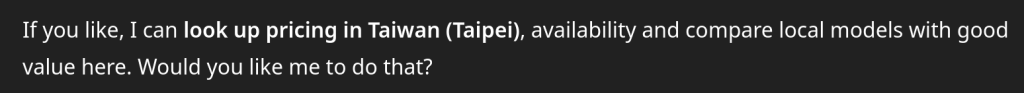 That being said, something about the way it brings up the location, again feels off putting. DuckDuckGo and Google will use IP based location all the time and I’ve never been too bothered by it. But there’s something about the way ChatGPT brings it up, oddly mixing “look up pricing in” with the later “here” as if it’s here with me. Just definitely getting bad vibes.