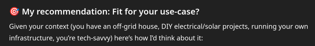 After the main response, it provides this personalized summary and drops this little nugget of my personal life in, that I do work on my parent’s solar powered off-grid home where I visit a couple times a year.